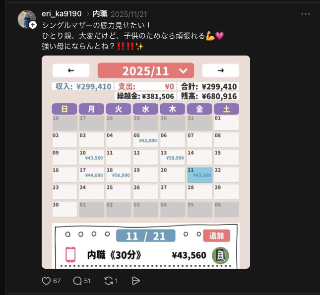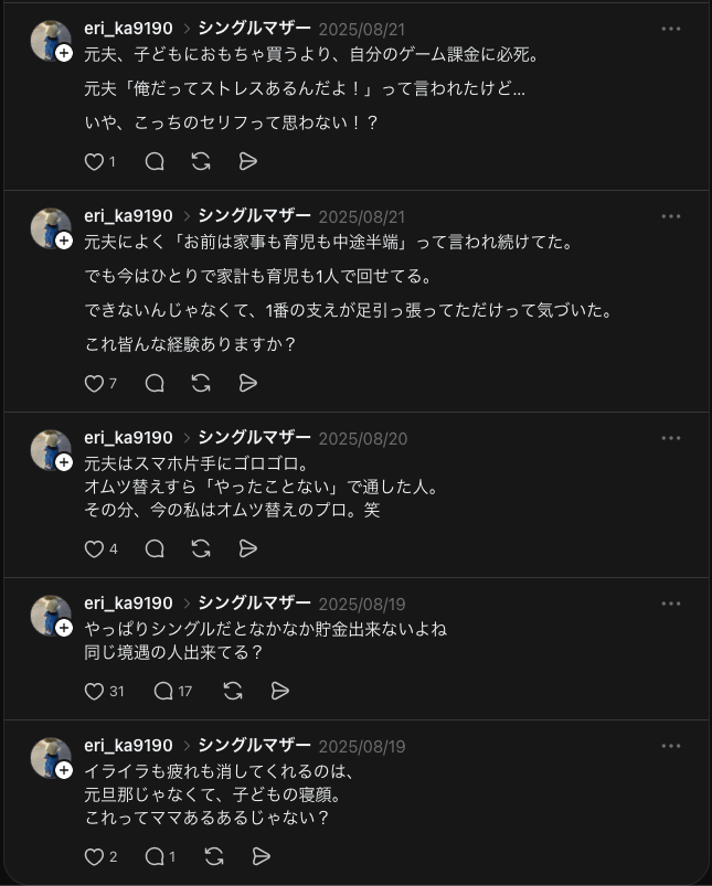 声には出せない、心の中で思っていることの発信も強いです。同じシンママの共感はもちろん、ポジティブなユーザー層からも応援をもらえます。