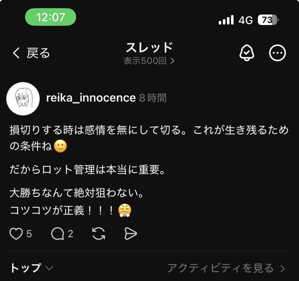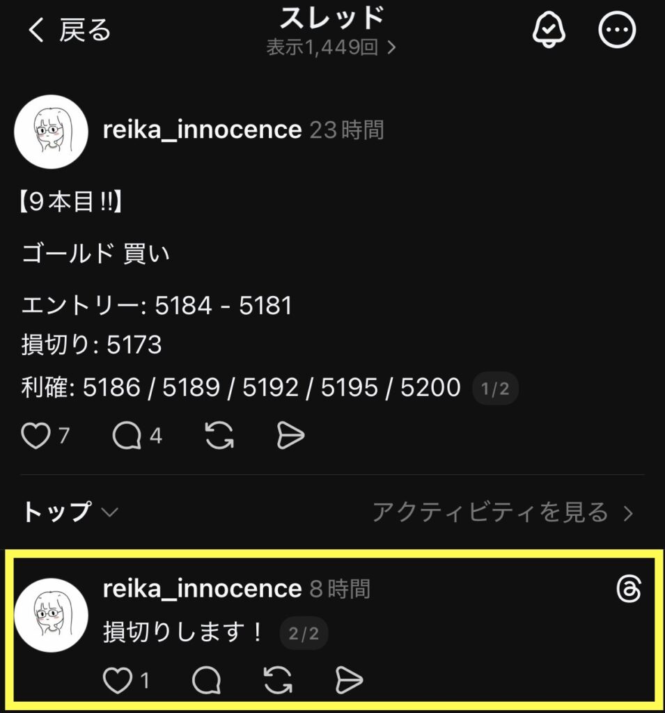 リアルタイムで宣言してもいいし、時間経ってから「損切りしました〜、次々ー!」みたいに、さりげなく書いとくのもOK。